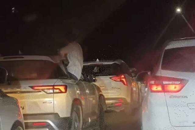 कार की विंडो पर बैठकर स्टंटबाजी, लगा जाम