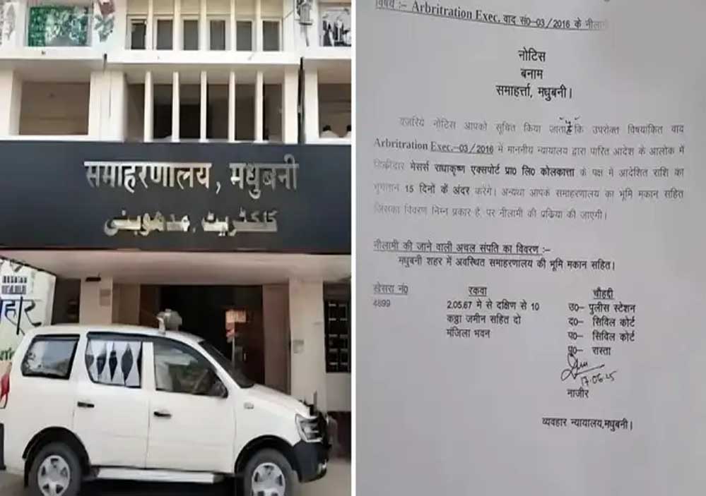 ज़रा सोचिए जब डीएम, एसपी कार्यालय परिसर ने ही कोर्ट का नोटिस चिपका दिया जाए कि 15 दिन में पूरे समाहरणालय को नीलाम कर दिया जाएगा तो कैसा लगेगा। शायद आपको लगेगा कि ये कोई मजाक होगा, लेकिन ऐसा नहीं है। बिहार हाई कोर्ट के आदेश की अवहेलना के चलते मधुबनी व्यवहार न्यायालय ने मधुबनी कलेक्ट्रेट (समाहरणालय) की नीलामी का आदेश दे दिया है। यह आदेश 4 करोड़ 17 लाख रुपये से अधिक की बकाया राशि के भुगतान न होने पर दिया गया है। कोर्ट ने कहा है कि अगर तय राशि 15 दिनों के अंदर नहीं चुकाई गई, तो प्रशासनिक मुख्यालय की संपत्ति की नीलामी होगी।