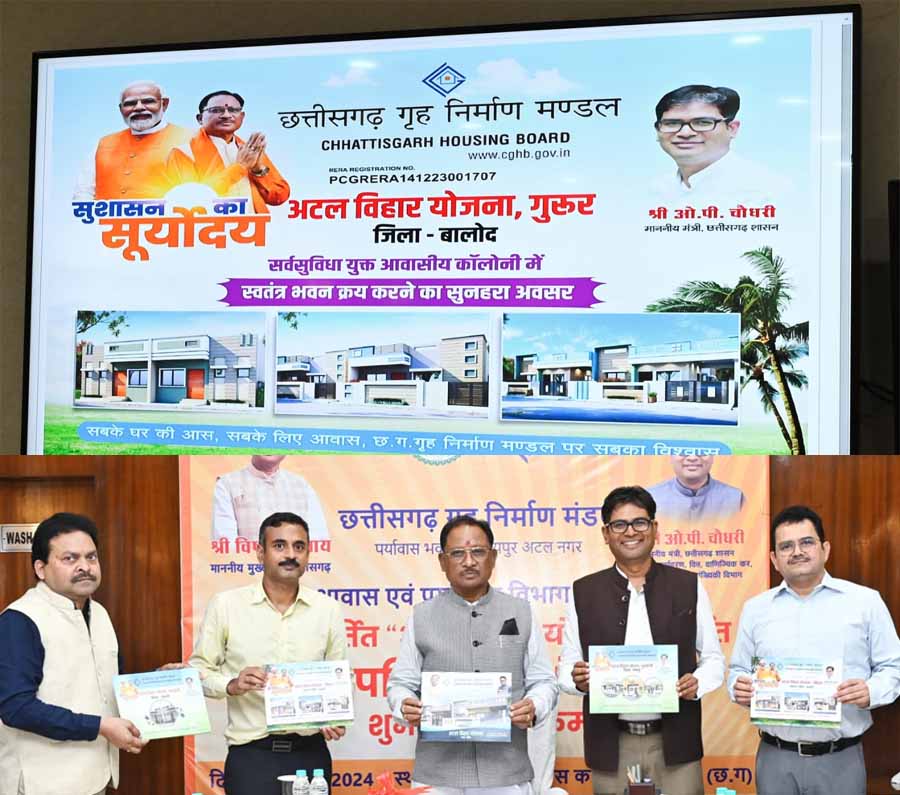 मुख्यमंत्री विष्णु देव साय ने 'सभी के लिए आवास' की परिकल्पना को साकार करने के उद्देश्य से मुख्यमंत्री निवास कार्यालय में "अटल विहार योजना" के अंतर्गत छत्तीसगढ़ गृह निर्माण मंडल की 7 आवासीय परियोजनाओं का शुभारंभ किया।