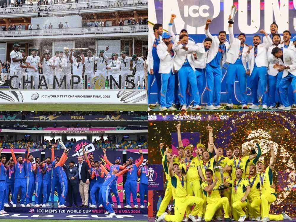 WTC फाइनल में साउथ अफ्रीका ने ऑस्ट्रेलिया को धूल चटाकर वर्ल्ड टेस्ट चैंपियनशिप का खिताब अपने नाम कर लिया है। 27 साल के लंबे अंतराल के बाद साउथ अफ्रीका कोई आईसीसी ट्रॉफी जीतने में कामयाब रहा है। अब अगला आईसीसी टूर्नामेंट 2026 में टी20 वर्ल्ड कप के रूप में होगा। ऐसे में आईए जानते हैं आईसीसी की चार ट्रॉफी -वनडे वर्ल्ड कप, टी20 वर्ल्ड कप, चैंपियंस ट्रॉफी और WTC मेस- किस-किस के बात है। साउथ अफ्रीका और ऑस्ट्रेलिया के पास एक-एक आईसीसी ट्रॉफी है और भारत दो का वर्ल्ड चैंपियन है।