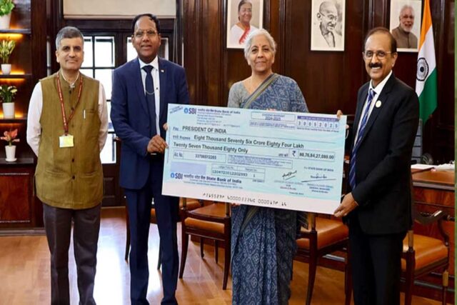 वित्त मंत्री के कार्यालय ने एक्स पर एक पोस्ट में कहा, "वित्त मंत्री निर्मला सीतारमण को भारतीय स्टेट बैंक के अध्यक्ष सीएस शेट्टी की ओर से वित्त वर्ष 2024-25 के लिए 8076.84 करोड़ रुपये का लाभांश चेक सौंपा गया।"
