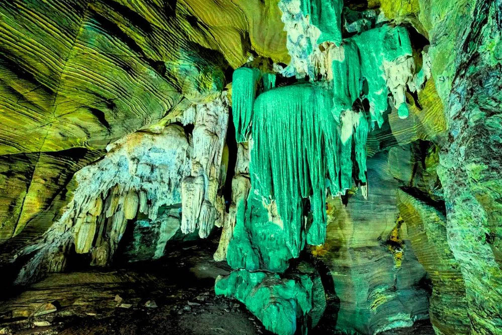 ग्रीन गुफा तक पहुंचने का मार्ग बड़े-बड़े पत्थरों से होकर गुजरता है। गुफा में प्रवेश करते ही सूक्ष्मजीवी जमाव से ढकी हरी दीवारें पर्यटकों को आकर्षित करती हैं। आगे बढ़ने पर एक विशाल कक्ष दिखाई देता है, जहां से भीतर की ओर चमकदार और विशाल स्टैलेक्टाइट्स तथा फ्लो-स्टोन (बहते पानी से बनी पत्थर की परतें) देखने को मिलती हैं, जो गुफा की प्राकृतिक भव्यता को और भी बढ़ा देती हैं।